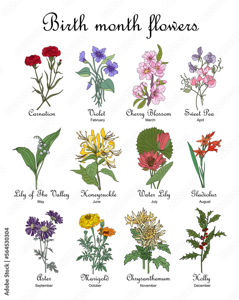 Set Of Birth Month Flowers Colorful Vector Illustrations Carnation Violet Cherry Blossom Sweet Pea Honeysuckle Lily Of The Valley Gladiolus Modern Design For Jewelry Tattoo Logo Wall Art Stock Vector Adobe